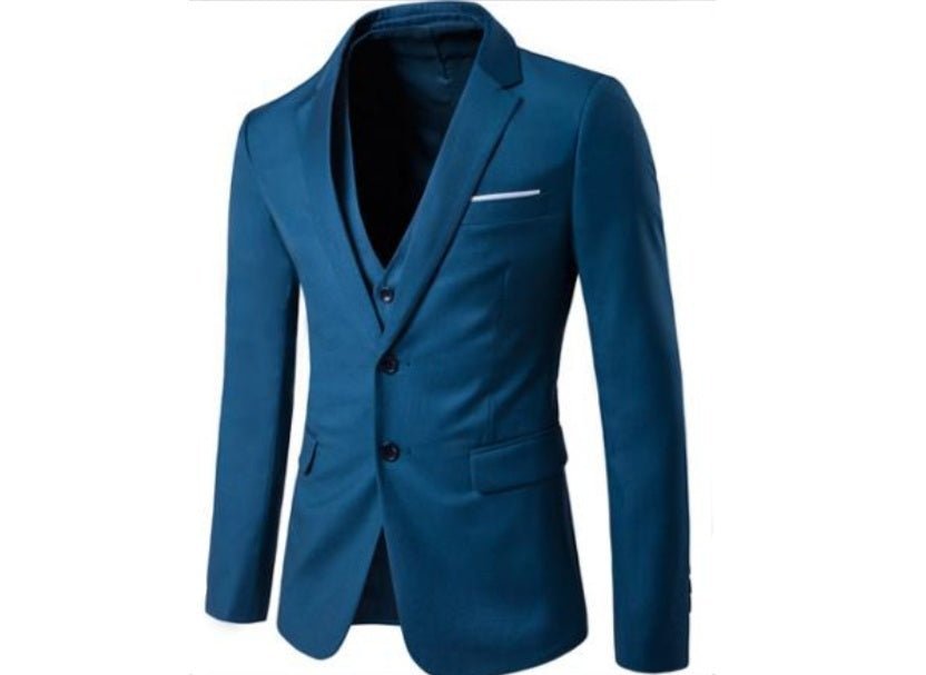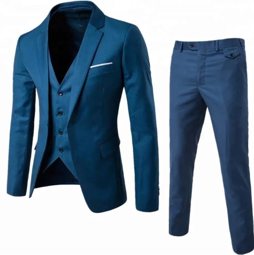 This teal set is designed and made from a high quality cotton fabric. It features a blazer with classic lapel collar and a single button, a three button waist coat and a pair of slim fir pants. This set is sure to add chic to your look. Style with a perfect bow tie and white shirt, all available from EDKAY, to give you the perfect look for that upcoming event - weddings, christenings... you name it. Or just go casual with the blazer, a t-shirt and a pair of denim jeans!