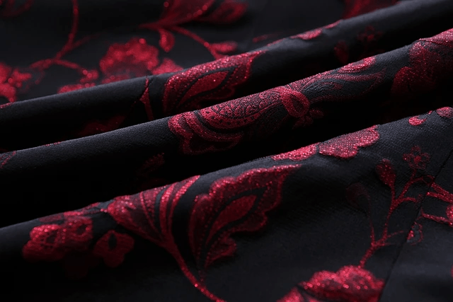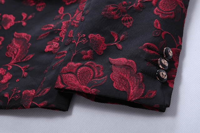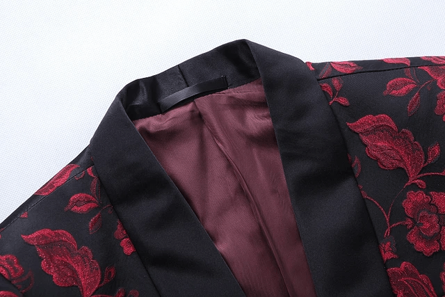 This red floral blazer is designed and made from high-quality velvet fabric. It features a black satin shawl collar and a single button. This blazer is sure to add chic to your look. Style with a perfect bow tie and white shirt, all available from EDKAY, to give you the perfect look for that upcoming event - weddings, christenings... you name it.