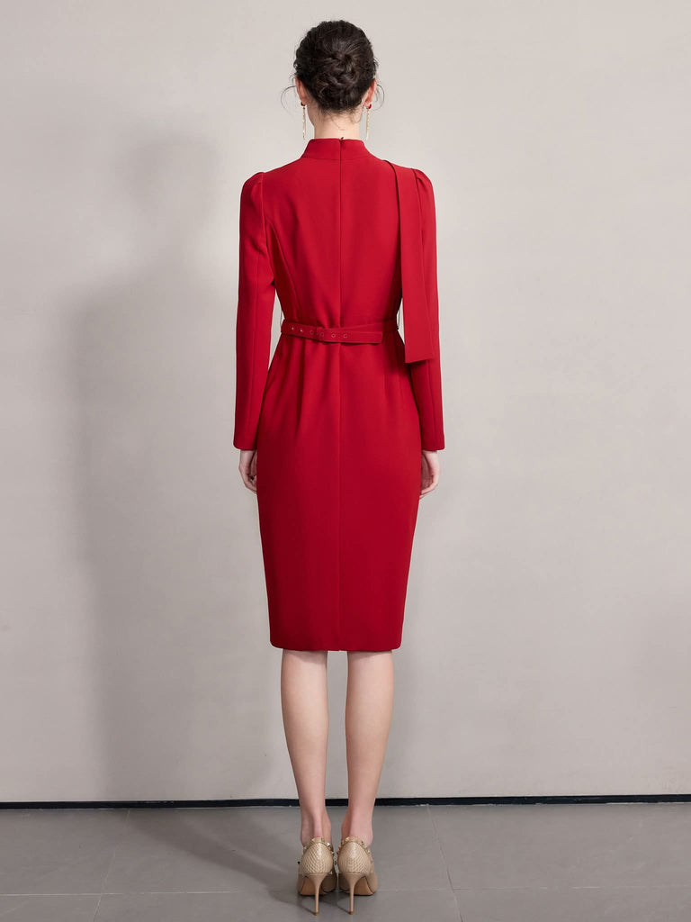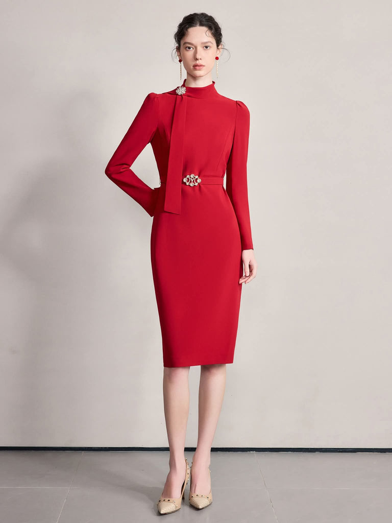 An icon of poised confidence, the Crimson Valeria Dress commands attention with its sculptural elegance. Tailored in a rich cardinal red, the design is defined by its high neckline and graceful scarf detail, fastened at the shoulder with a jeweled brooch. A cinched waist, accented with a crystal clasp, flows into a sleek pencil silhouette that skims the figure with quiet authority.