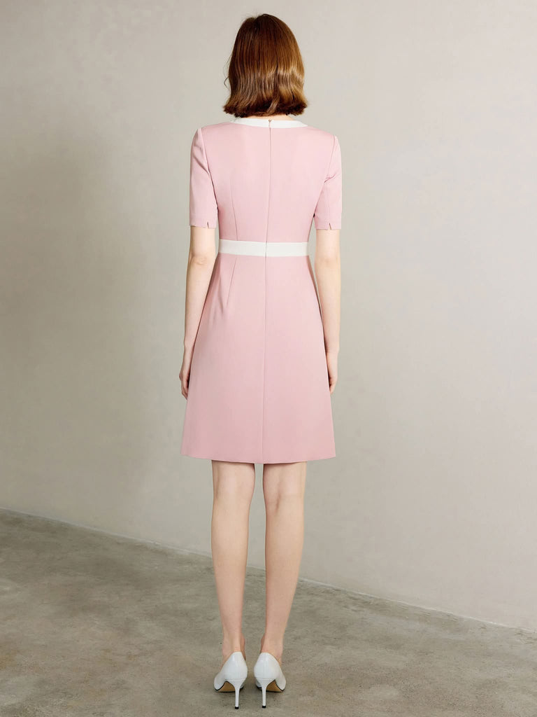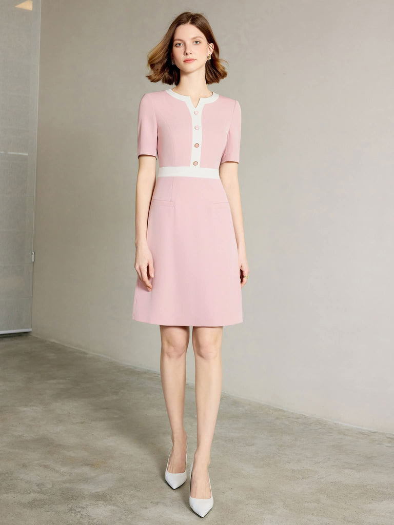 The dress features a sculpted silhouette, with a soft A-line cut that flatters the form while allowing graceful movement. A contrasting ivory trim delicately frames the neckline and button placket, creating architectural balance and visual clarity.