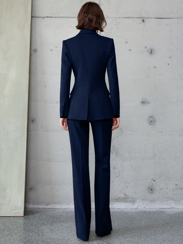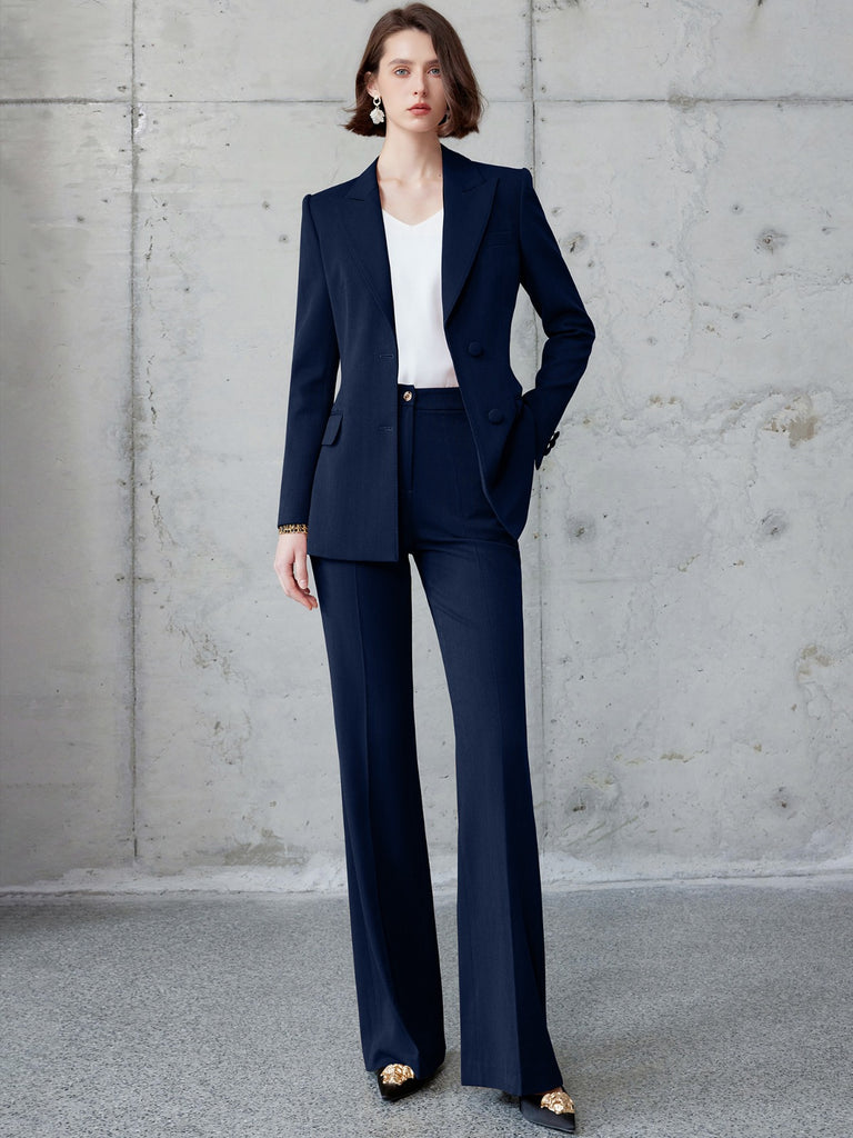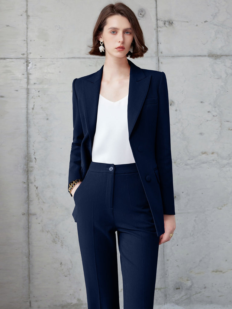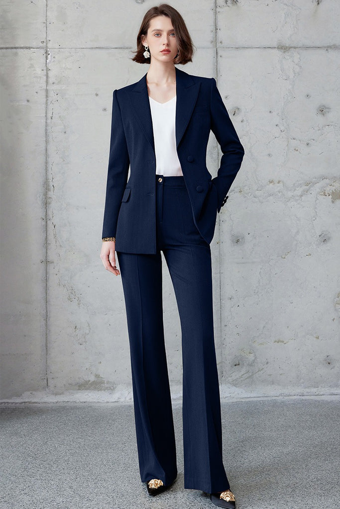 This neatly tailored 2-piece navy blue pants suit is made from a high-quality worsted polyester fabric. The blazer features a double button design with a clean finish.
