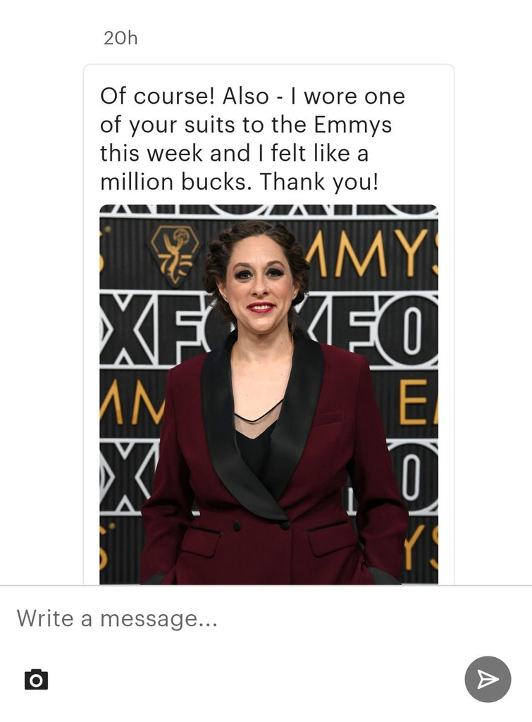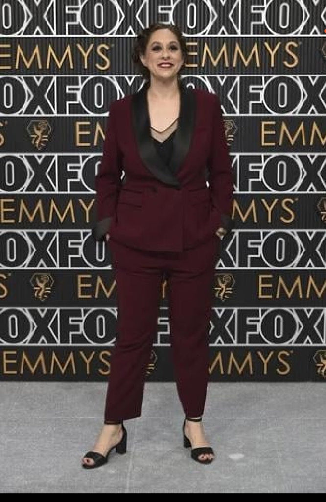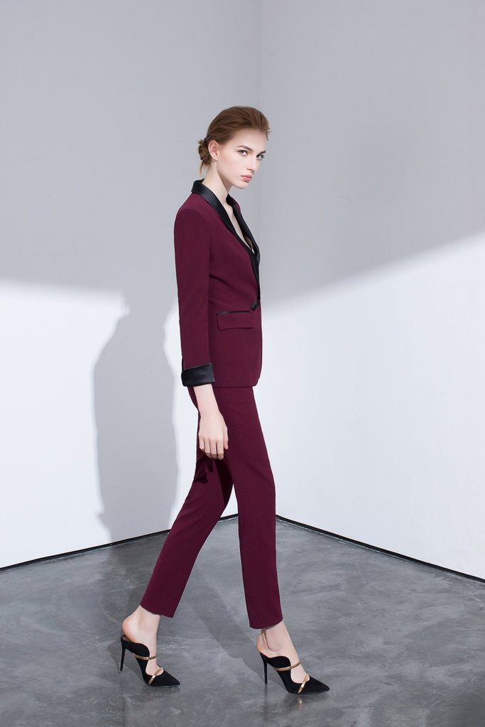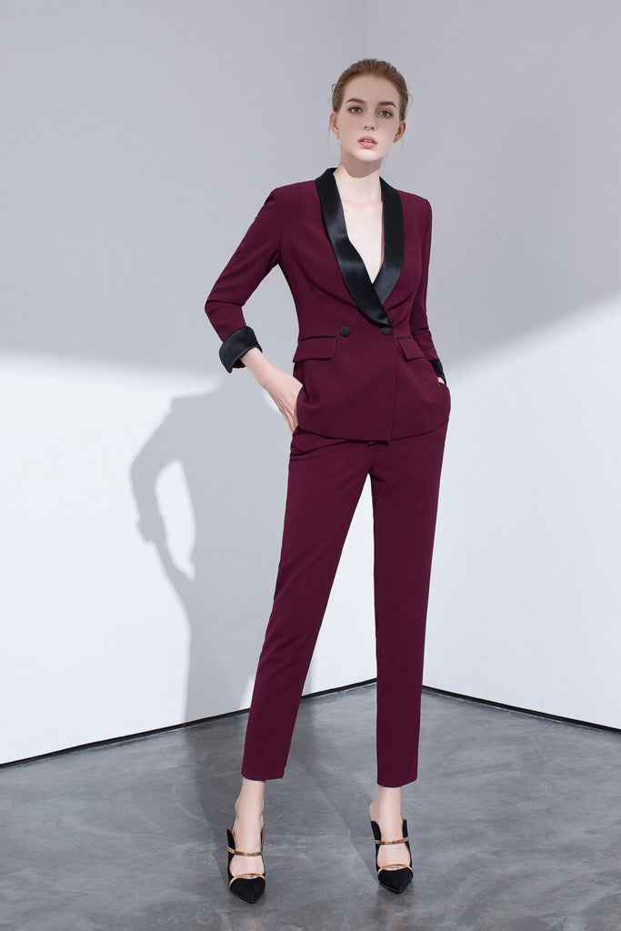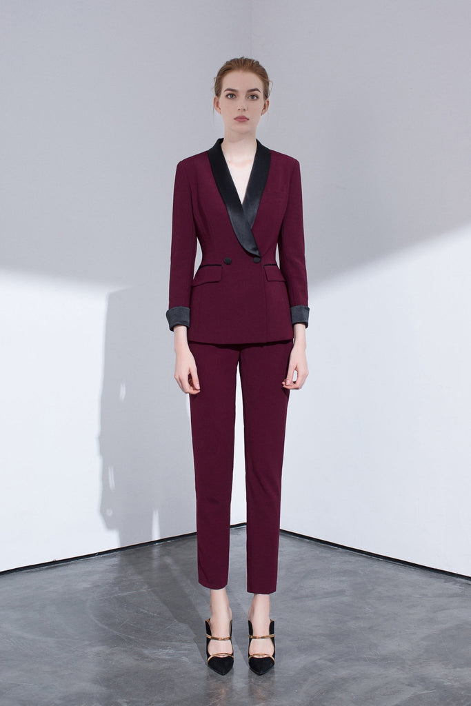 Burgundy 2-piece double-breasted pants suit with satin collar piping