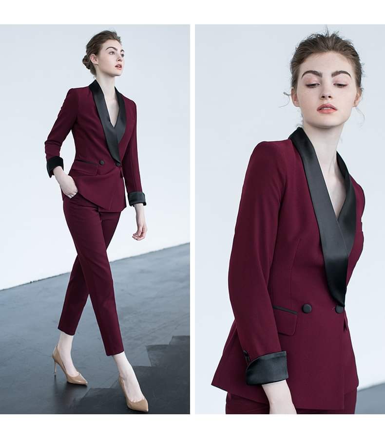 This double-breasted Burgundy 2-piece pants suit is made from a high-quality worsted polyester fabric. The black satin buttons and decoration on the lapel collar, pockets, and on the folded sleeves will contrast your look with perfection. The blazer also features a double-breasted design with a clean finish.