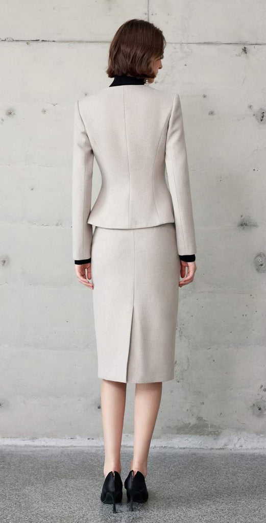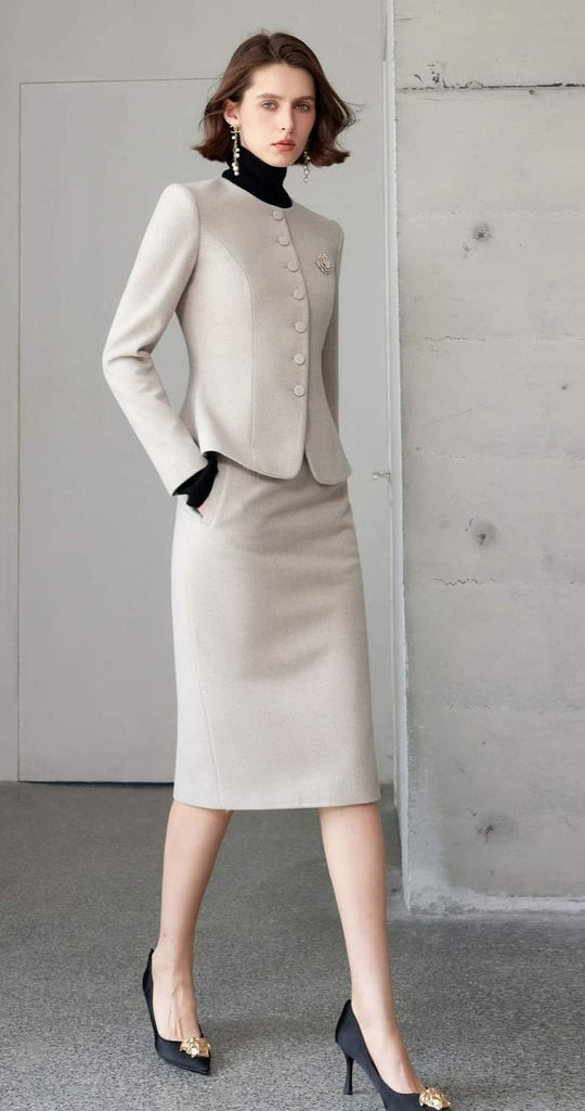 The luxury finish of this ecru skirt suit will add exquisite colour to your wardrobe and take your confidence to the next level. The set features a decorated fitted blazer and tailored skirt with pockets to give you ease and style, ideal for any setting where standing out matters to you. Made from a luxury viscose fabric blend which this suit set is sure to work well in all settings that matter - from boardroom meetings to after-work events.