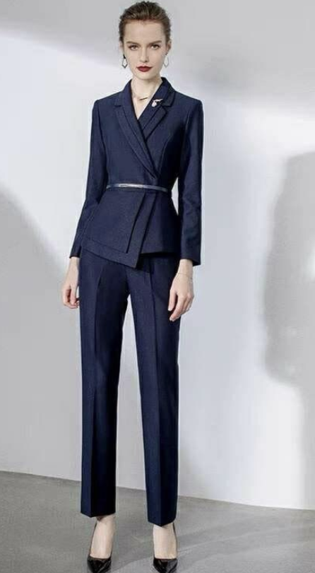 The tailored blazer features a clean wrap-style front, enhanced by a subtle belt detail that accentuates the waist and elevates the overall look. Paired with streamlined trousers cut to elongate the leg, this suit delivers a polished, confident presence ideal for professional settings and formal occasions alike.