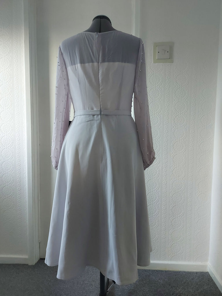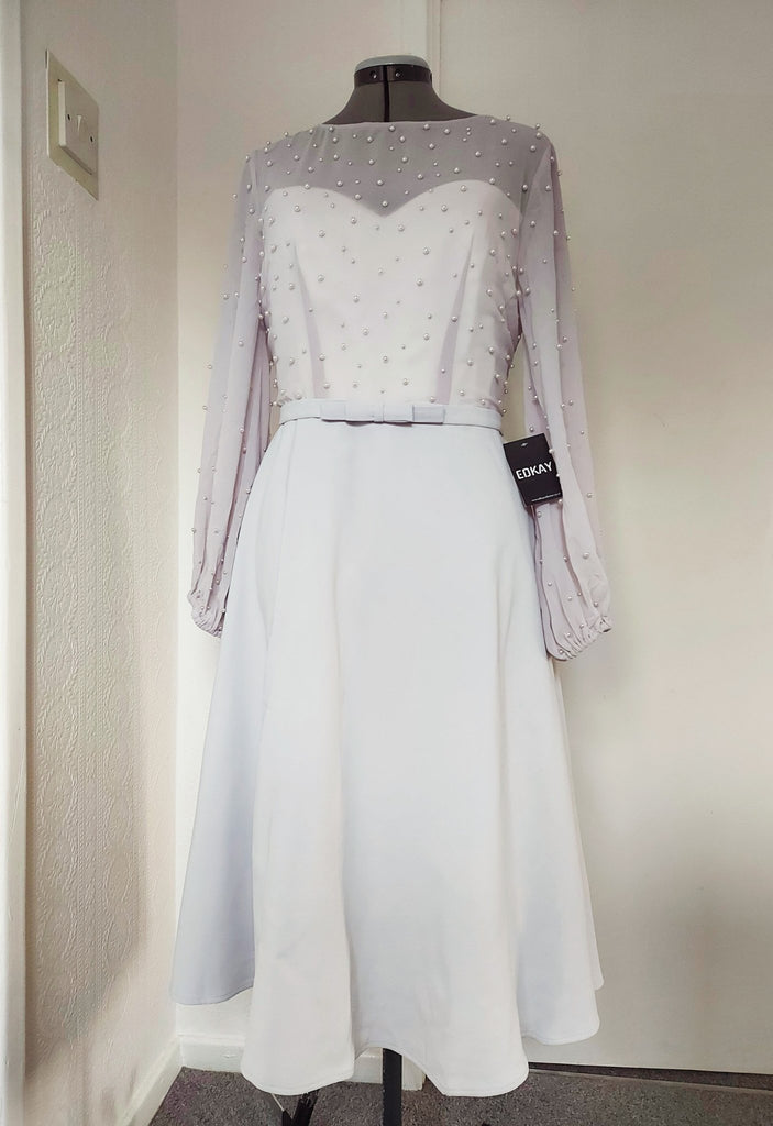 This grey dress, made from a medium weight crepe fabric features a hand-finished pearl decoration. It is a glamorous and ethereal dress, featuring a flowy A-line silhouette and exquisite pearl embellishments that add a touch of luxury and charm to the outfit. Its shimmering grey color exudes elegance, making it a perfect choice for formal occasions and evening events.