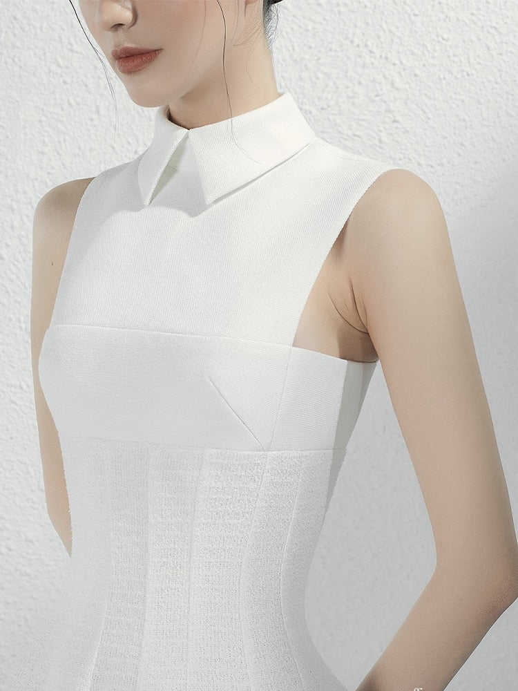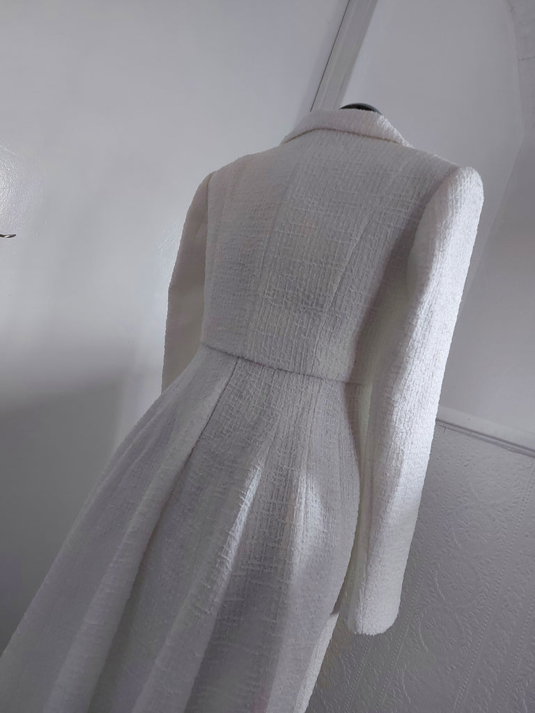 Effortlessly chic, this white long-sleeved swing suit dress is a versatile and stylish choice for any occasion. The dress features a flattering swing silhouette that adds movement and grace to the overall look.